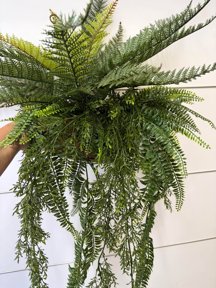 This wall mounted 35cm basket is filled with a mix of high quality UV ferns.